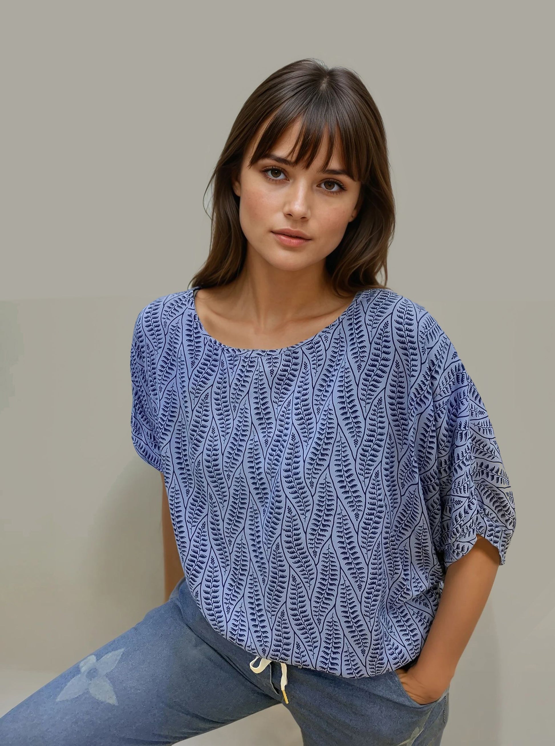 MONA LISA-S Haut décontracté à manches courtes – Imprimé feuillage bleu GDB